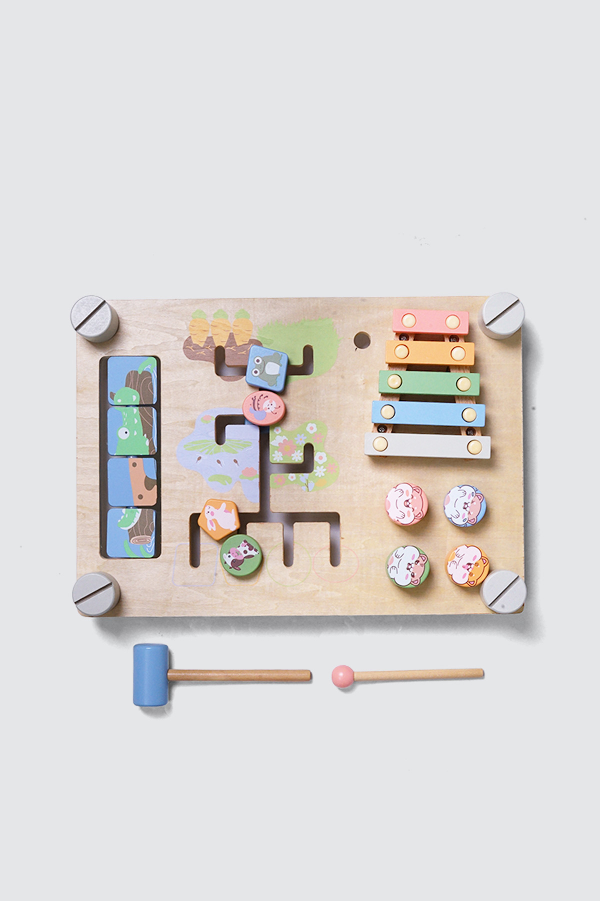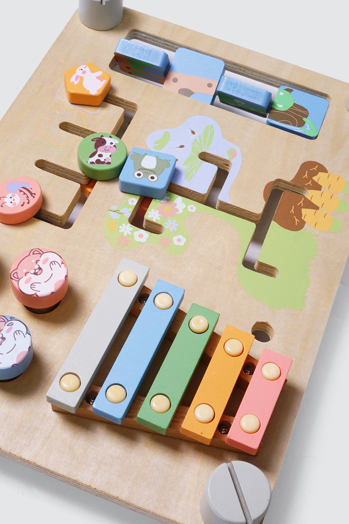 Includes xylophone, hammer toy, maze, puzzle, wooden gears, simple bolt & screw set, and basic counting/number/shape board. - Safe for children: made from smooth, high-quality materials